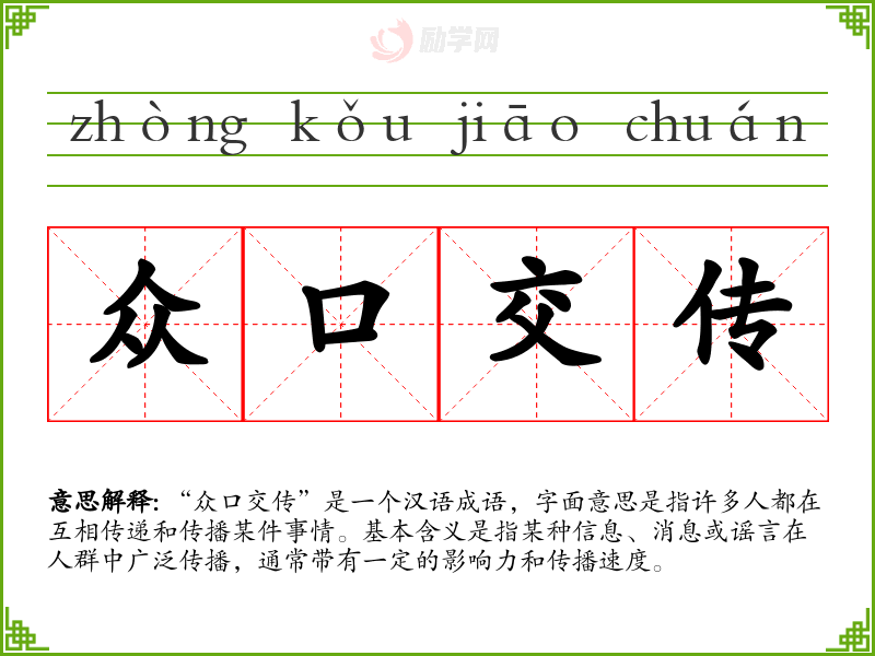 “众口交传”是一个汉语成语,字面意思是指许多人都在互相传递和传播某件事情。基本含义是指某种信息、消息或谣言在人群中广泛传播,通常带有一定的影响力和传播速度。