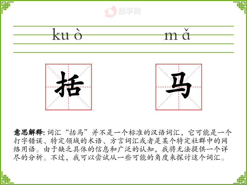 总的来说,由于“括马”不是一个标准的汉语词汇,我们无法提供一个详尽的分析。如果这个词汇确实存在,并且你有更多的背景信息,请提供,以便进行更深入的探讨。