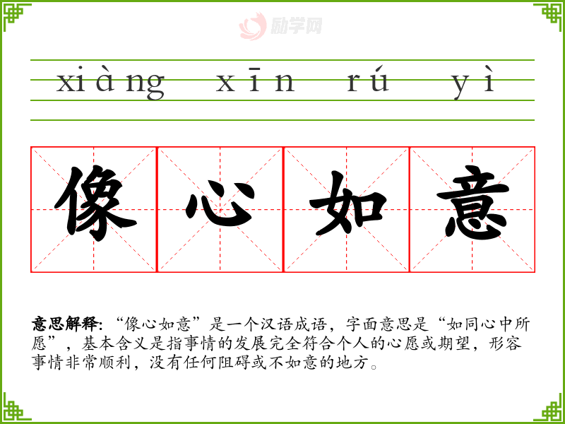 “像心如意”是一个汉语成语,字面意思是“如同心中所愿”,基本含义是指事情的发展完全符合个人的心愿或期望,形容事情非常顺利,没有任何阻碍或不如意的地方。