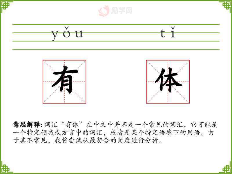词汇“有体”在中文中并不是一个常见的词汇,它可能是一个特定领域或方言中的词汇,或者是某个特定语境下的用语。由于其不常见,我将尝试从最契合的角度进行分析。