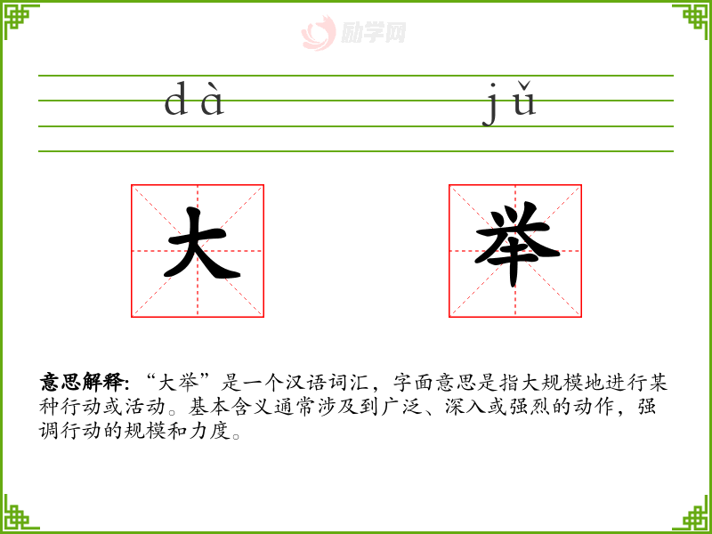 - 文学语境:在文学作品中,“大举”常用来形容战争、起义、迁徙等***的社会活动,如“大举进攻”、“大举移民”。