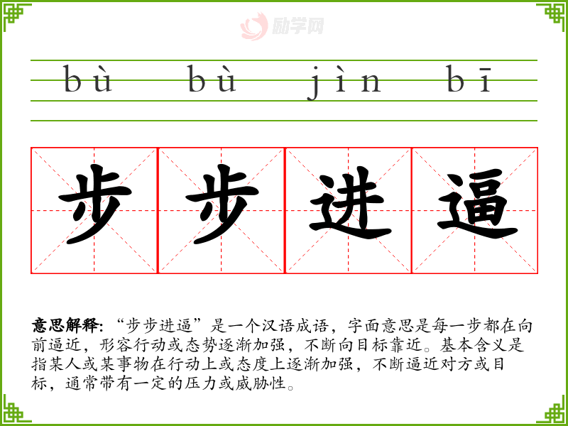“步步进逼”是一个汉语成语,字面意思是每一步都在向前逼近,形容行动或态势逐渐加强,不断向目标靠近。基本含义是指某人或某事物在行动上或态度上逐渐加强,不断逼近对方或目标,通常带有一定的压力或威胁性。