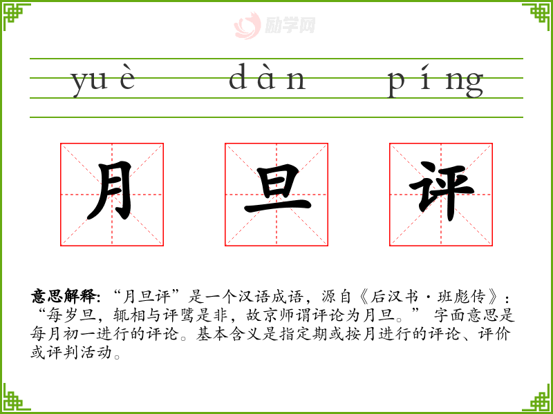 “月旦评”是一个汉语成语,源自《后汉书·班彪传》:“每岁旦,辄相与评骘是非,故京师谓评论为月旦。” 字面意思是每月初一进行的评论。基本含义是指定期或按月进行的评论、评价或评判活动。