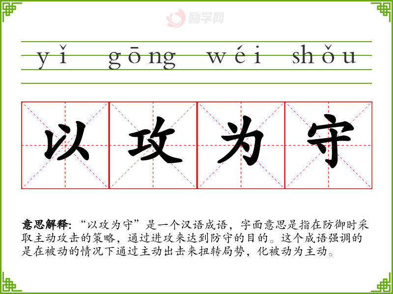 “以攻为守”是一个汉语成语,字面意思是指在防御时采取主动攻击的策略,通过进攻来达到防守的目的。这个成语强调的是在被动的情况下通过主动出击来扭转局势,化被动为主动。