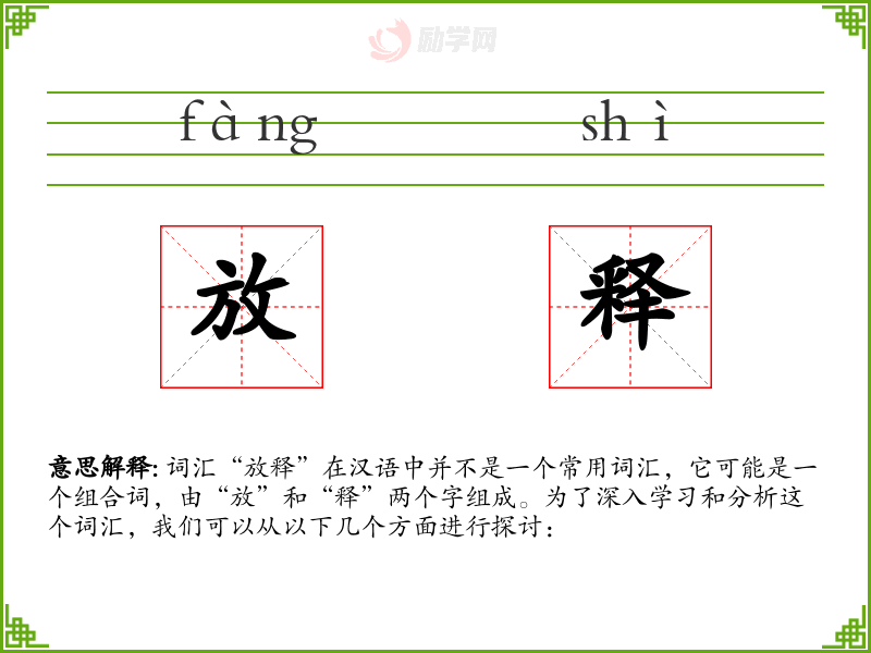 词汇“放释”在汉语中并不是一个常用词汇,它可能是一个组合词,由“放”和“释”两个字组成。为了深入学*和分析这个词汇,我们可以从以下几个方面进行探讨: