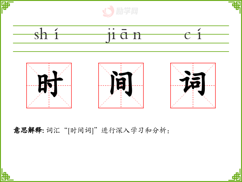 “时间词”是指用来表示时间概念的词汇,包括时间点、时间段、时间顺序等。它们在语言中用于描述**发生的时刻、持续的长度或先后顺序。