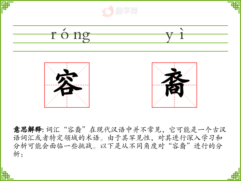 词汇“容裔”在现代汉语中并不常见,它可能是一个古汉语词汇或者特定领域的术语。由于其罕见性,对其进行深入学*和分析可能会面临一些挑战。以下是从不同角度对“容裔”进行的分析: