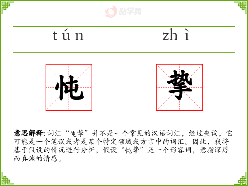 词汇“忳挚”并不是一个常见的汉语词汇,经过查询,它可能是一个笔误或者是某个特定领域或方言中的词汇。因此,我将基于假设的情况进行分析,假设“忳挚”是一个形容词,意指深厚而真诚的情感。