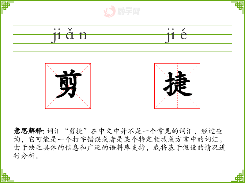 词汇“剪捷”在中文中并不是一个常见的词汇,经过查询,它可能是一个打字错误或者是某个特定领域或方言中的词汇。由于缺乏具体的信息和广泛的语料库支持,我将基于假设的情况进行分析。