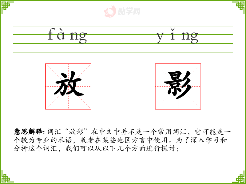 “放影”这个词汇可能是由“放”和“影”两个字组合而成,其中“放”有释放、展示的意思,“影”指影像。在现代汉语中,这个词汇的使用并不广泛,可能在一些特定的行业或地区方言中有所保留。