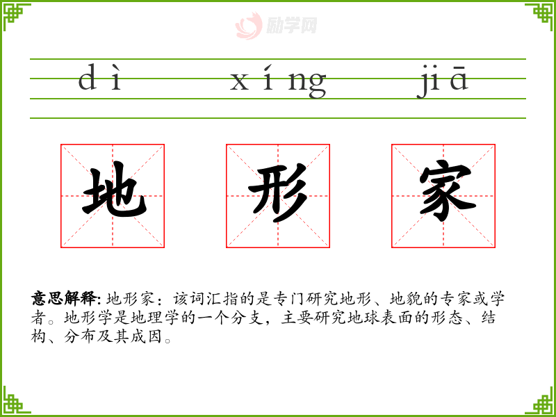 - 理解:地形家是地理学领域的专业人士,他们的工作对于环境保护和资源开发具有重要意义。
