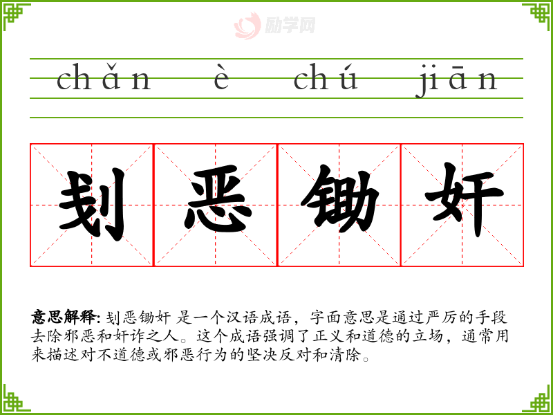 刬恶锄奸 是一个汉语成语,字面意思是通过严厉的手段去除邪恶和奸诈之人。这个成语强调了正义和道德的立场,通常用来描述对不道德或邪恶行为的坚决反对和清除。