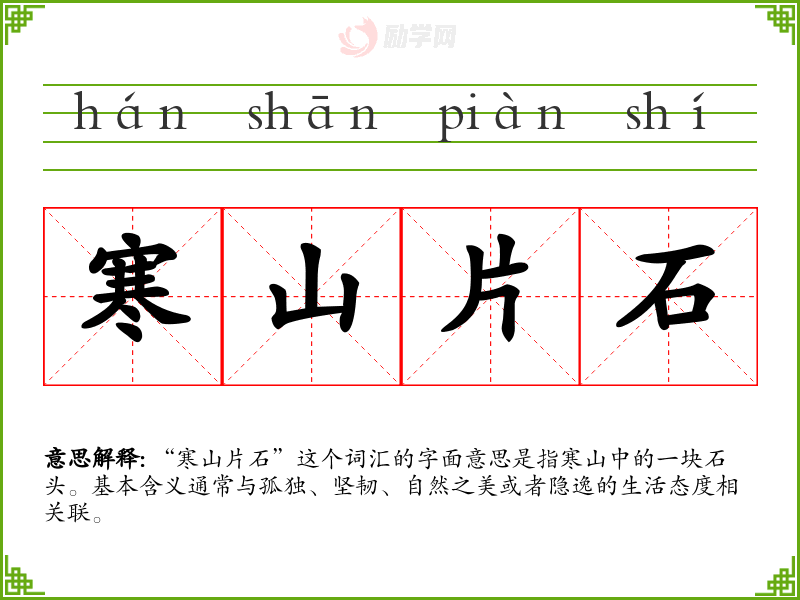“寒山片石”这个词汇的字面意思是指寒山中的一块石头。基本含义通常与孤独、坚韧、自然之美或者隐逸的生活态度相关联。