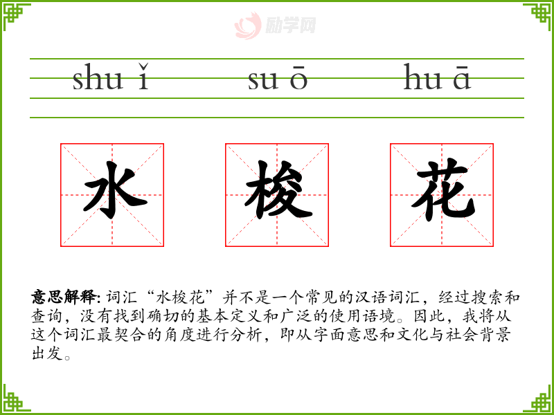词汇“水梭花”并不是一个常见的汉语词汇,经过搜索和查询,没有找到确切的基本定义和广泛的使用语境。因此,我将从这个词汇最契合的角度进行分析,即从字面意思和文化与社会背景出发。