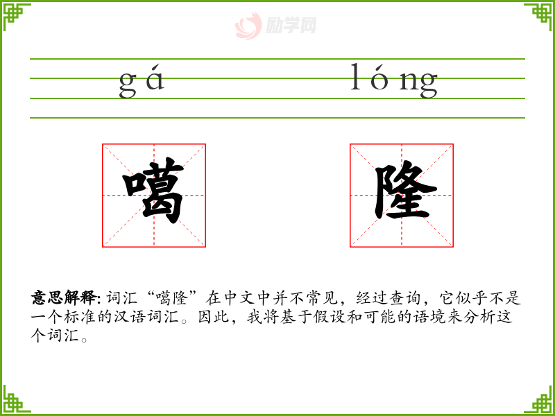 由于“噶隆”不是一个标准汉语词汇,我们无法给出确切的字面意思和基本含义。如果这是一个方言词汇或网络新词,它可能代表某种特定的声音、动作或状态。