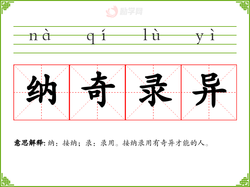 纳奇录异的意思是:纳:接纳;录:录用。接纳录用有奇异才能的人。