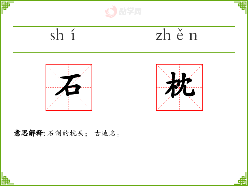 《说文》-石,山石也。在厂之下,口象形。 《诗·小雅·鹤鸣》-它山之石。 《释名》-山体曰石。 《易·豫》-介于石。 《易·说卦传》-艮为小石。 《周礼·典同》-原声石。 《吕氏春秋·精通》-慈石召铁或引之也。 《书·大传》。注:“石材,柱下质;石承,当柱下而已。”-大夫有石材,庶人有石承。 清·方苞《左忠毅公逸事》-吾师肺肝,皆铁石所铸造也。