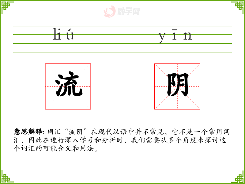 词汇“流阴”在现代汉语中并不常见,它不是一个常用词汇,因此在进行深入学*和分析时,我们需要从多个角度来探讨这个词汇的可能含义和用法。