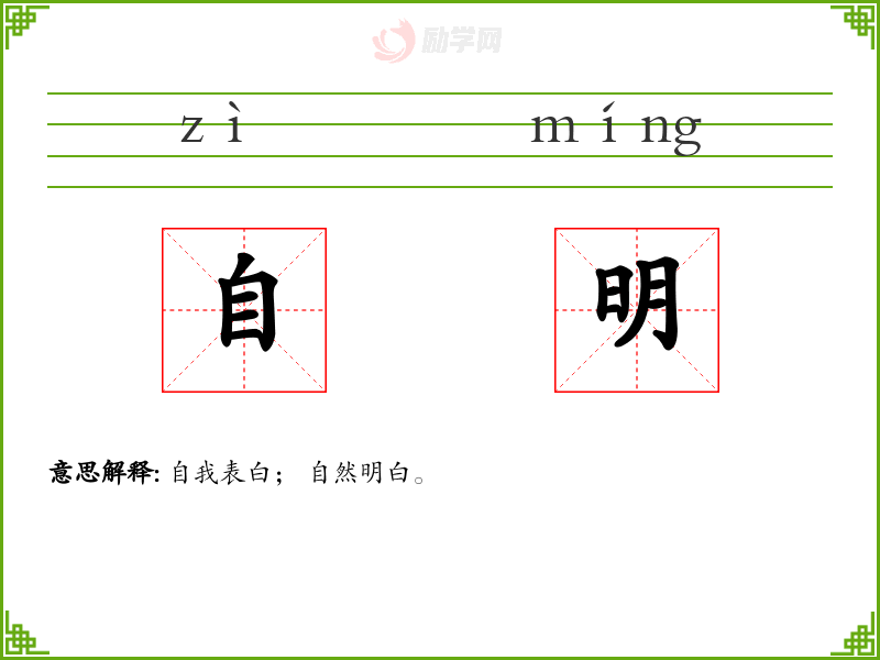 《说文》-朙,照也。 《左传·昭公二十八年》-照临四方曰明。 《诗·齐风·鸡鸣》-东方明矣。 《国语·周语》-明,精白也。 《书·洪范》-视曰明。 《礼记·中庸》-明则著。 《尔雅》-明星谓之启明。 《诗·小雅·大东》-东有启明。 《荀子·天论》-在天者莫明于日月。 唐·李白《秋浦歌》-不知明镜里,何处得秋霜。 苏轼《赤壁赋》-“月明星稀,乌鹊南飞”,此非曹孟德之诗乎? 方苞《狱中杂记》-禁卒居中央,牖其以通明,屋极有窗以达气。 清·薛福成《观巴黎油画记》-明月斜挂。 唐·杜甫《春夜喜雨》-江船火独明。 蔡元培《图画》-明暗之掩映。