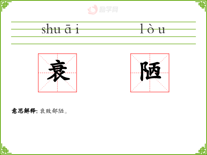 衰[ shuāi ] 1. (会意。从衣,从冄(rǎn)。“冄”象草毛茸茸的样子。是“蓑衣”的“蓑”的本字。(suǒ)本义:蓑衣。)。 2. 力量减退,衰落,没落。与“盛”相对。 【引证】 《素问·疟论》。注:“谓病衰退也。”-衰则气复反入。 《左传·庄公十年》-一鼓作气,再而衰,三而竭。 宋·欧阳修《新五代史·伶官传·序》-呜呼!盛衰之理,虽曰天命,岂非人事哉! 【组词】 衰末、 衰旺、 衰季、 衰废、 衰宗、 衰门、 衰薄 [更多解释]