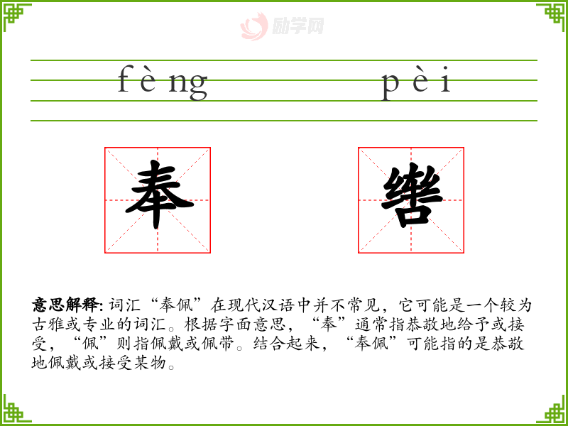 - 词源:“奉”和“佩”都是古代汉语中的常用字,组合起来形成了一个表达特定礼仪行为的词汇。