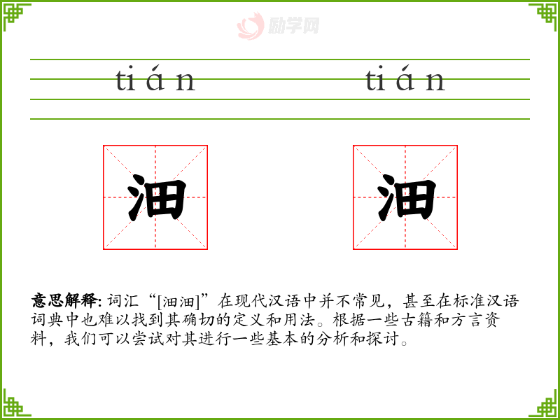 词汇“[沺沺]”在现代汉语中并不常见,甚至在标准汉语词典中也难以找到其确切的定义和用法。根据一些古籍和方言资料,我们可以尝试对其进行一些基本的分析和探讨。