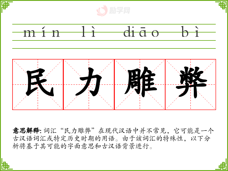 词汇“民力雕弊”在现代汉语中并不常见,它可能是一个古汉语词汇或特定历史时期的用语。由于该词汇的特殊性,以下分析将基于其可能的字面意思和古汉语背景进行。