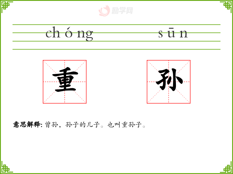 重孙的意思是:曾孙,孙子的儿子。也叫重孙子。