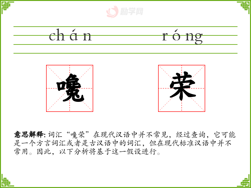 词汇“嚵荣”在现代汉语中并不常见,经过查询,它可能是一个方言词汇或者是古汉语中的词汇,但在现代标准汉语中并不常用。因此,以下分析将基于这一假设进行。