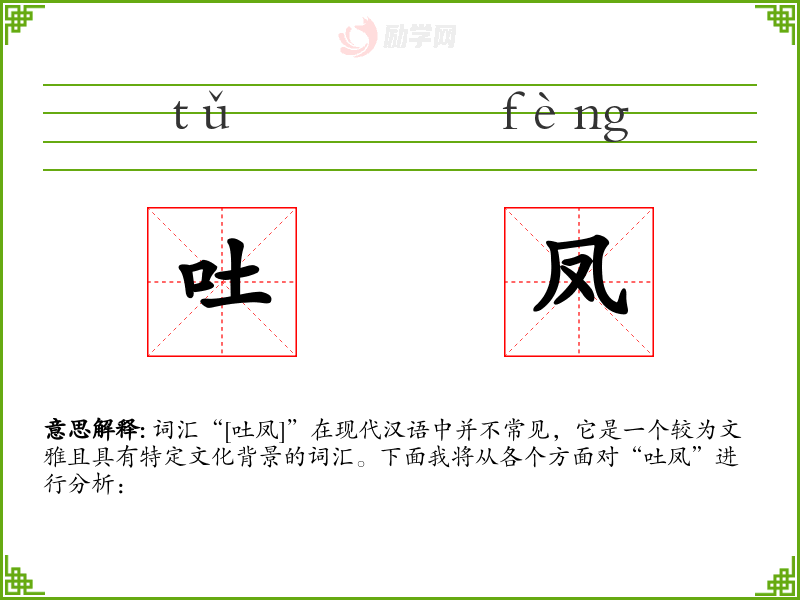 词汇“[吐凤]”在现代汉语中并不常见,它是一个较为文雅且具有特定文化背景的词汇。下面我将从各个方面对“吐凤”进行分析: