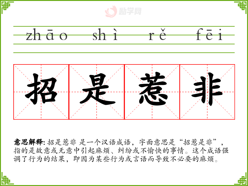 招是惹非 是一个汉语成语,字面意思是“招惹是非”,指的是故意或无意中引起麻烦、纠纷或不愉快的事情。这个成语强调了行为的结果,即因为某些行为或言语而导致不必要的麻烦。