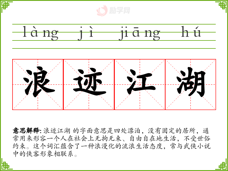 浪迹江湖 的字面意思是四处漂泊,没有固定的居所,通常用来形容一个人在社会上无拘无束、自由自在地生活,不受世俗约束。这个词汇蕴含了一种浪漫化的流浪生活态度,常与武侠小说中的侠客形象相联系。