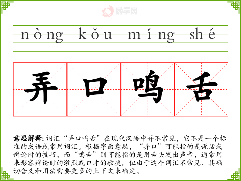由于“弄口鸣舌”不是一个标准词汇,我们无法给出一个确切的基本定义。它可能是某个特定方言或文学作品中的创造性用法。