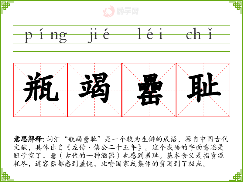 词汇“瓶竭罍耻”是一个较为生僻的成语,源自**古代文献,具体出自《左传·僖公二十五年》。这个成语的字面意思是瓶子空了,罍(古代的一种酒器)也感到羞耻。基本含义是指资源耗尽,连容器都感到羞愧,比喻国家或集体的贫困到了极点。