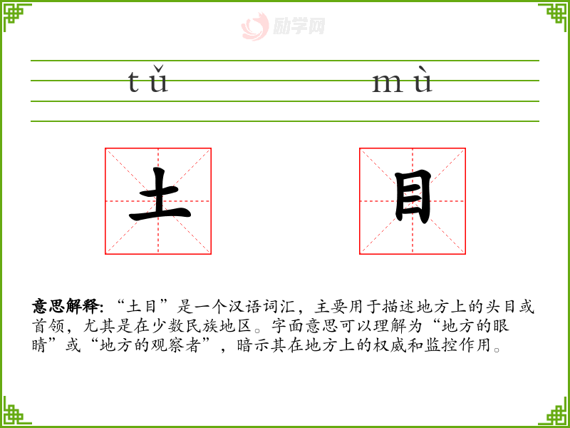 “土目”是一个汉语词汇,主要用于描述地方上的头目或首领,尤其是在少数民族地区。字面意思可以理解为“地方的眼睛”或“地方的观察者”,暗示其在地方上的权威和监控作用。
