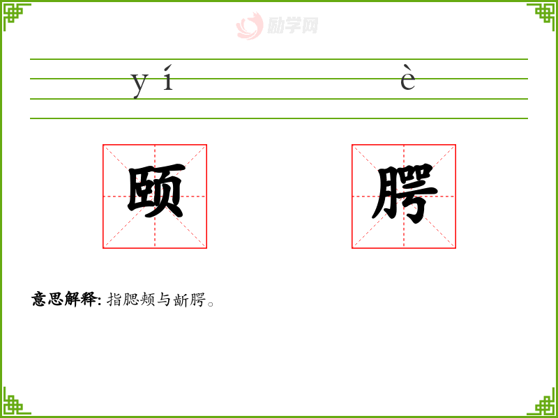 (形声。从页(xié),臣(yí)声。臣,面颊,繁化作“颐”。本义:下巴) 同本义。