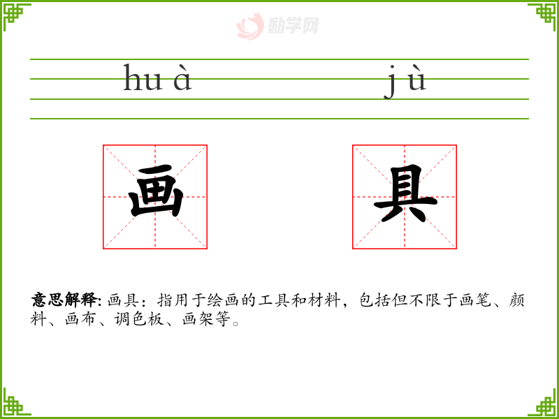 - 词源:“画具”一词由“画”和“具”组成,其中“画”指绘画,“具”指工具或器具。