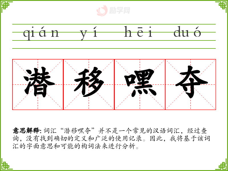 “潜移嘿夺”字面意思可能是指某种隐秘的、不易察觉的影响或改变,其中“潜移”可能指的是潜移默化的影响,而“嘿夺”则可能指的是悄悄地夺取或改变。