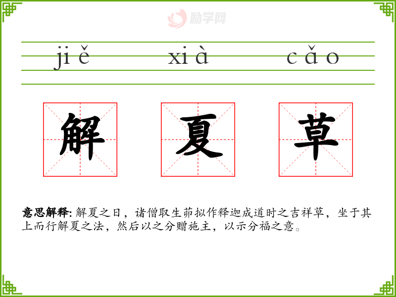 解夏草的意思是:解夏之日,诸僧取生茆拟作释迦成道时之吉祥草,坐于其上而行解夏之法,然后以之分赠施主,以示分福之意。