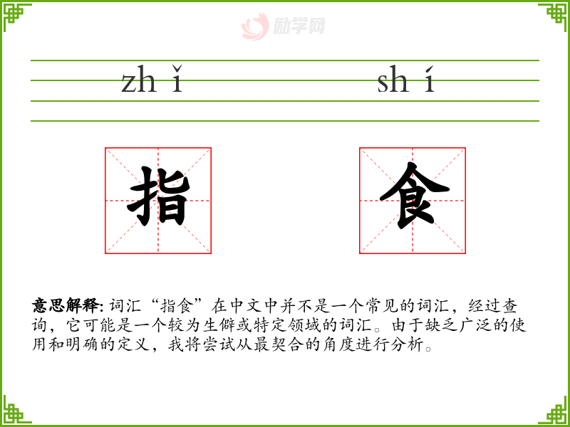 词汇“指食”在中文中并不是一个常见的词汇,经过查询,它可能是一个较为生僻或特定领域的词汇。由于缺乏广泛的使用和明确的定义,我将尝试从最契合的角度进行分析。