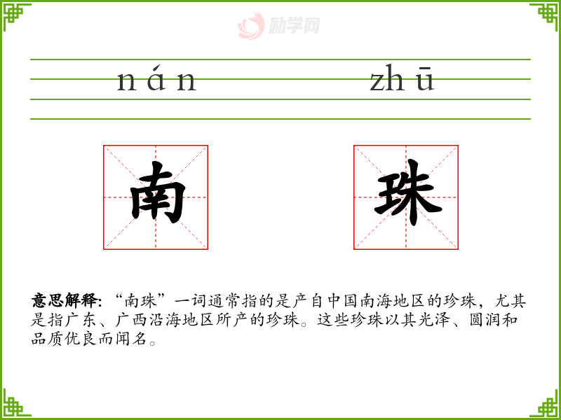 - 反义词:北珠(如果存在的话,通常指北方产的珍珠)