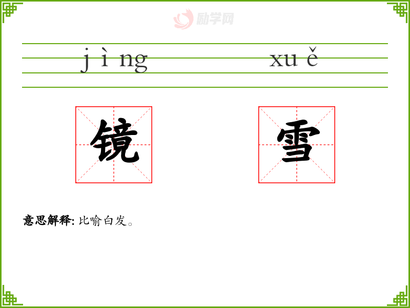 《玉篇》-镜,鉴也。 《说文》-镜,景也。 《大戴礼记·保傅》-明镜者可以察形也。 《汉书·谷永传》-以镜考己行。 《战国策·齐策》-窥镜而自视。 《乐府诗集·木兰诗》-对镜帖花黄。 唐·李白《秋浦歌》-不知明镜里。 明·袁宏道《满井游记》-如镜之新开。
