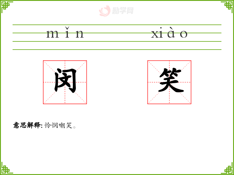 《说文》。杨承庆曰:“竹得风,其体夭屈,如人之笑也。李阳冰刊定说文从之。”-笑,喜也。 《字林》。朱骏声曰:“此字古皆从犬,本义犬狎人声也。从犬,箾省声。”-竹为乐器,君子乐然后笑也。 《易·萃》-一握为笑。 《诗·卫风·氓》-载笑载言。 《列子·汤问》-两小儿笑曰。 《论语·宪问》-乐然后笑,人不厌其笑。 《聊斋志异·狼三则》-止增笑耳。 《列子·汤问》-笑而止之。 清·周容《芋老人传》-笑而不顾。