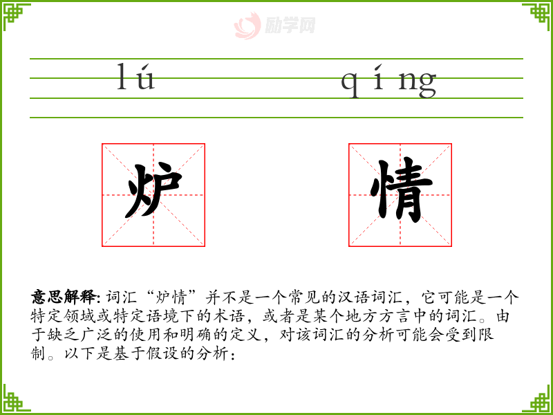 词汇“炉情”并不是一个常见的汉语词汇,它可能是一个特定领域或特定语境下的术语,或者是某个地方方言中的词汇。由于缺乏广泛的使用和明确的定义,对该词汇的分析可能会受到限制。以下是基于假设的分析:
