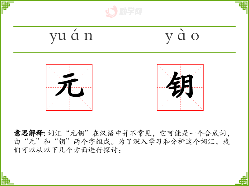 - “元钥”这个词汇虽然不常见,但它提供了一个丰富的象征性框架,可以用于表达深层次的理解或解锁复杂问题的能力。在语言学习和表达中,了解和运用这样的词汇可以增加表达的深度和丰富性。