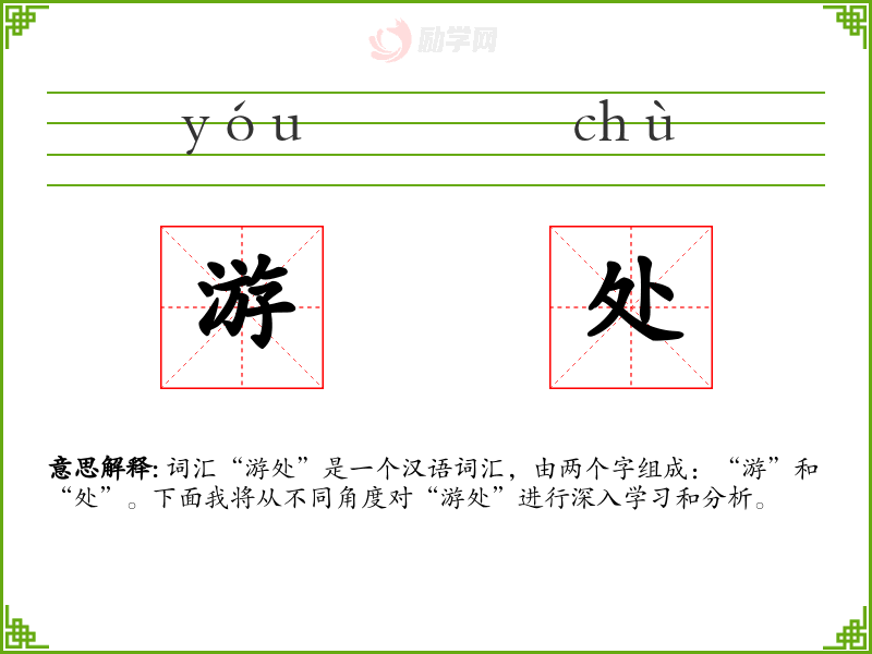词汇“游处”是一个汉语词汇,由两个字组成:“游”和“处”。下面我将从不同角度对“游处”进行深入学*和分析。