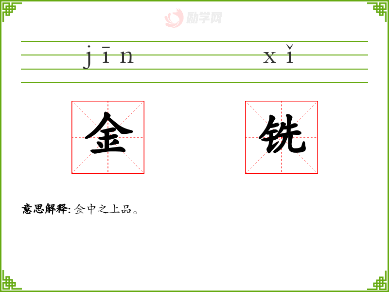 《说文》-金,五色金也。黄为之长。久埋不生衣,百錬不轻,从革不违,西方之行,生于土,从土左右。注:象金在土中形。 《尔雅·释地》-西南之美者,有华山之金石焉。 《易·妒》-系于金柅。 《书·禹贡》。注:“铜三色也。”-惟金三品。 唐·李朝威《柳毅传》-项掣金锁。
