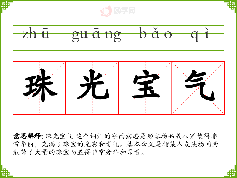 珠光宝气 这个词汇的字面意思是形容物品或人穿戴得非常华丽,充满了珠宝的光彩和贵气。基本含义是指某人或某物因为装饰了大量的珠宝而显得非常奢华和昂贵。