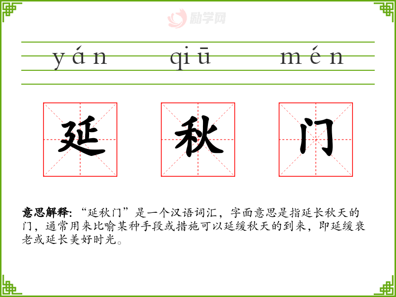 “延秋门”是一个汉语词汇,字面意思是指延长秋天的门,通常用来比喻某种手段或措施可以延缓秋天的到来,即延缓衰老或延长美好时光。