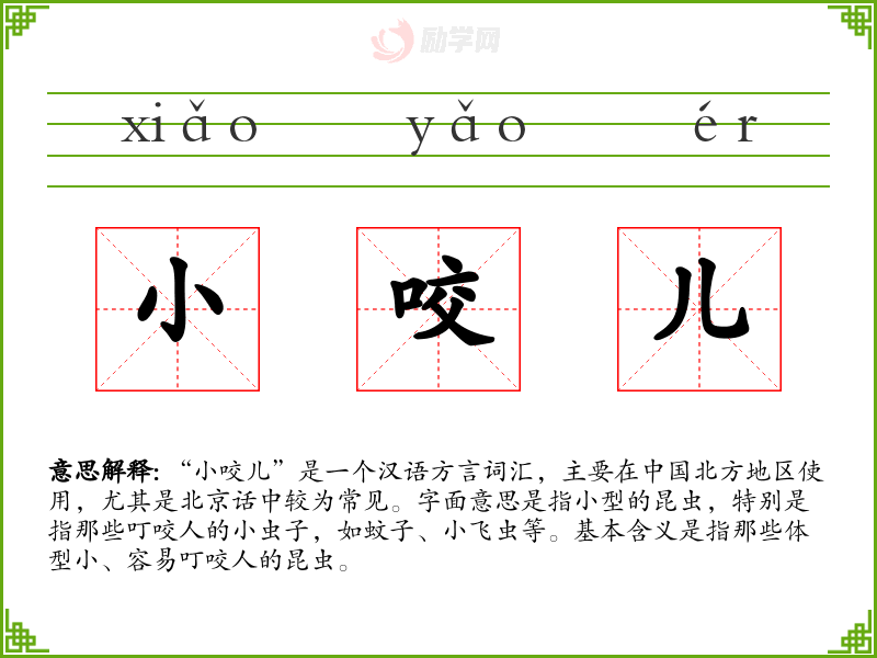 “小咬儿”是一个汉语方言词汇,主要在**北方地区使用,尤其是北京话中较为常见。字面意思是指小型的昆虫,特别是指那些叮咬人的小虫子,如蚊子、小飞虫等。基本含义是指那些体型小、容易叮咬人的昆虫。